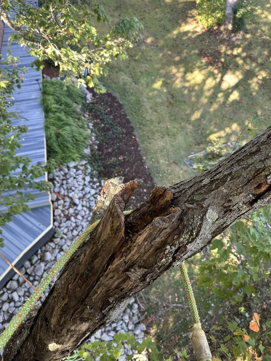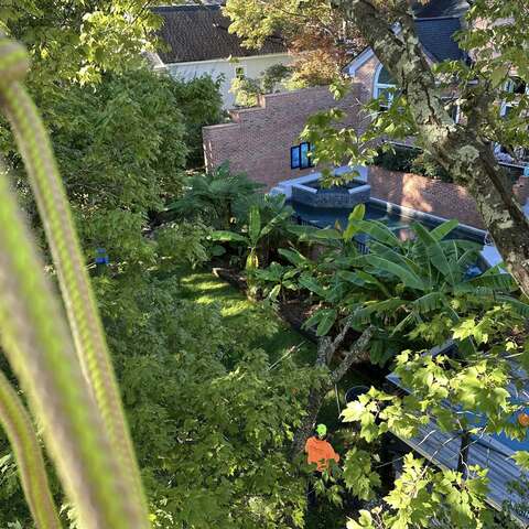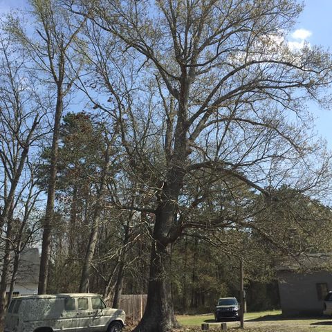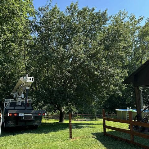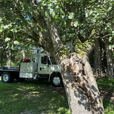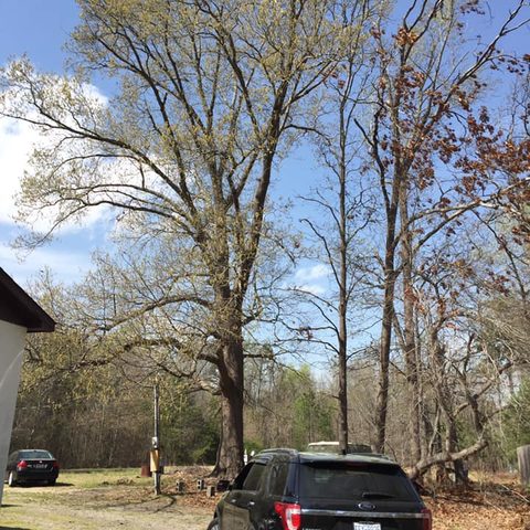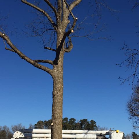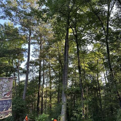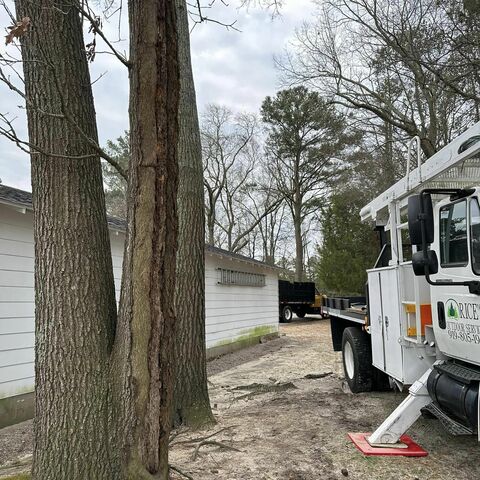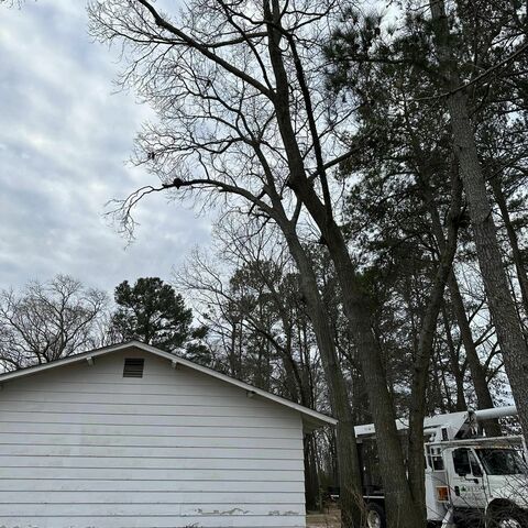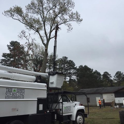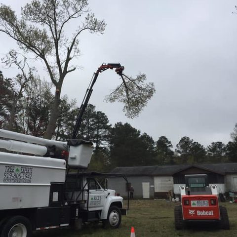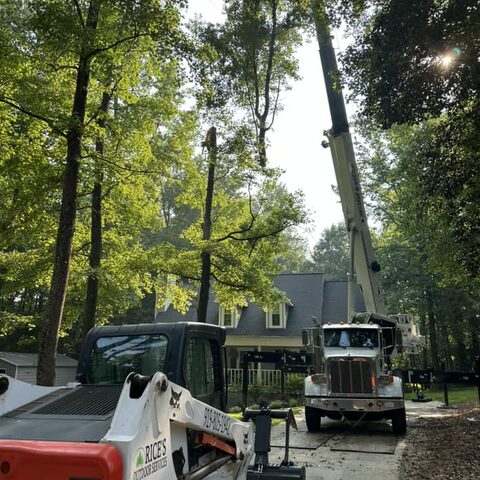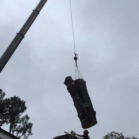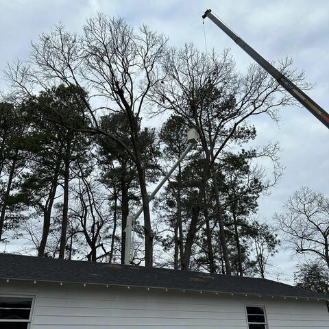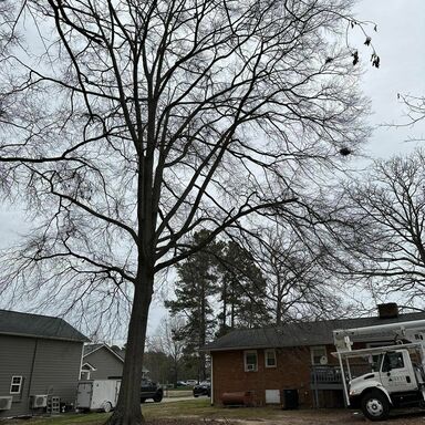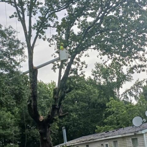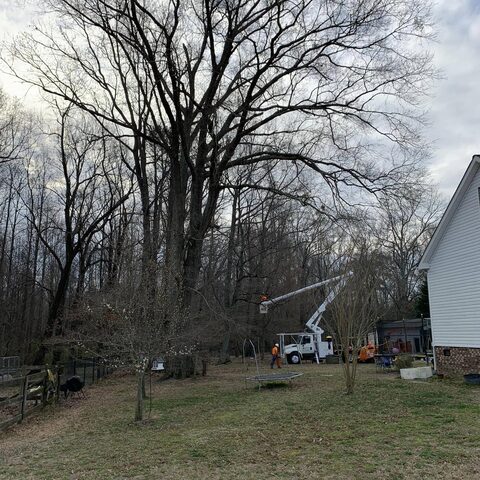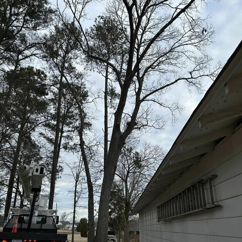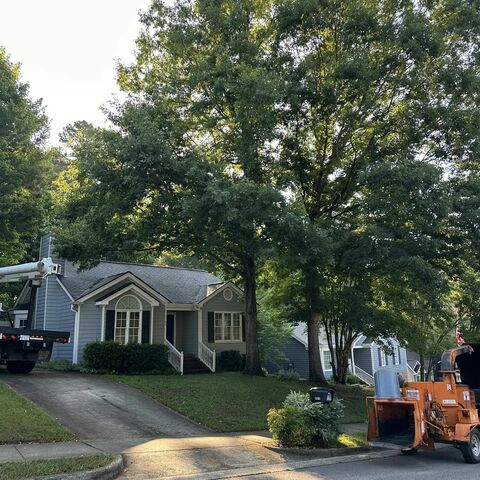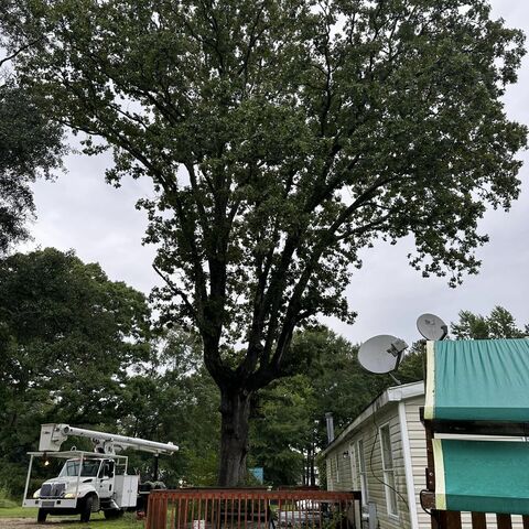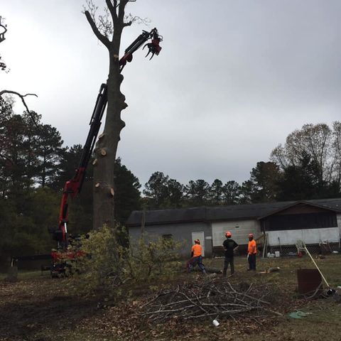 Safely removed large oak and several other trees with state of the art equipment. This machine can reach up to 100 foot. Grabs section of the tree, cuts it and lays it down to be processed by ground crew.