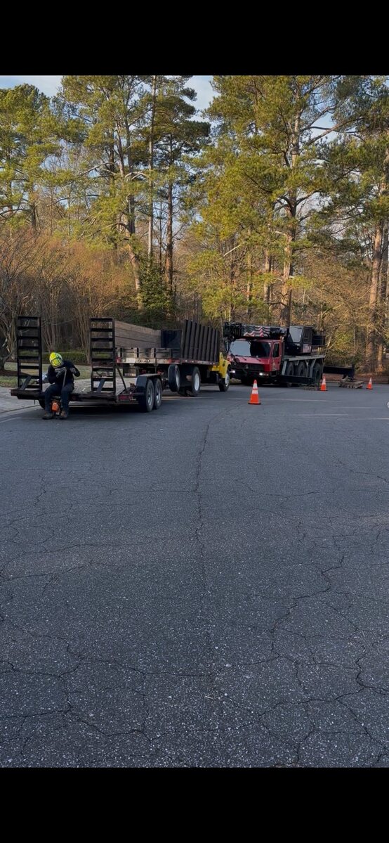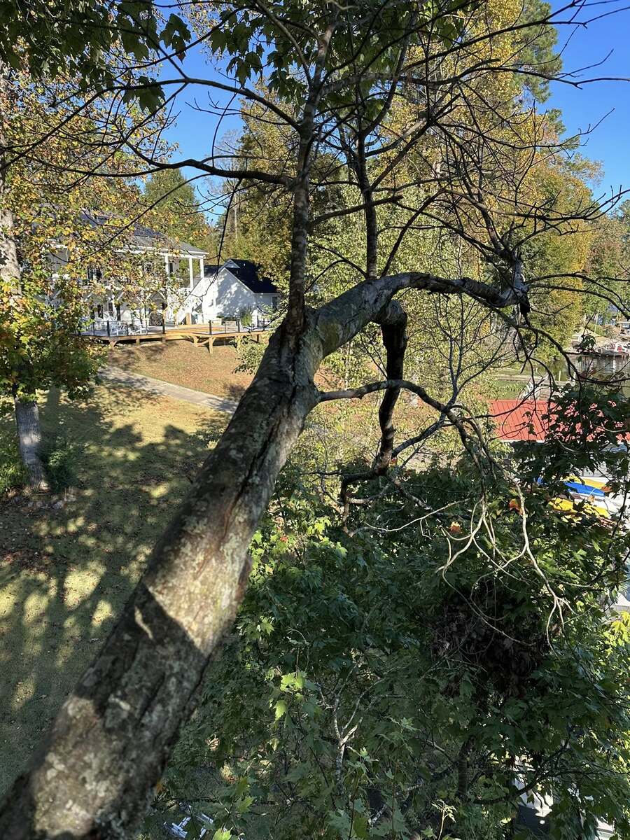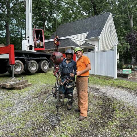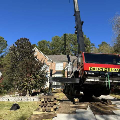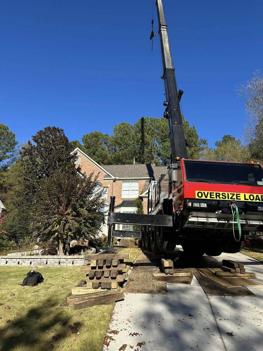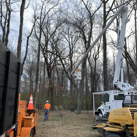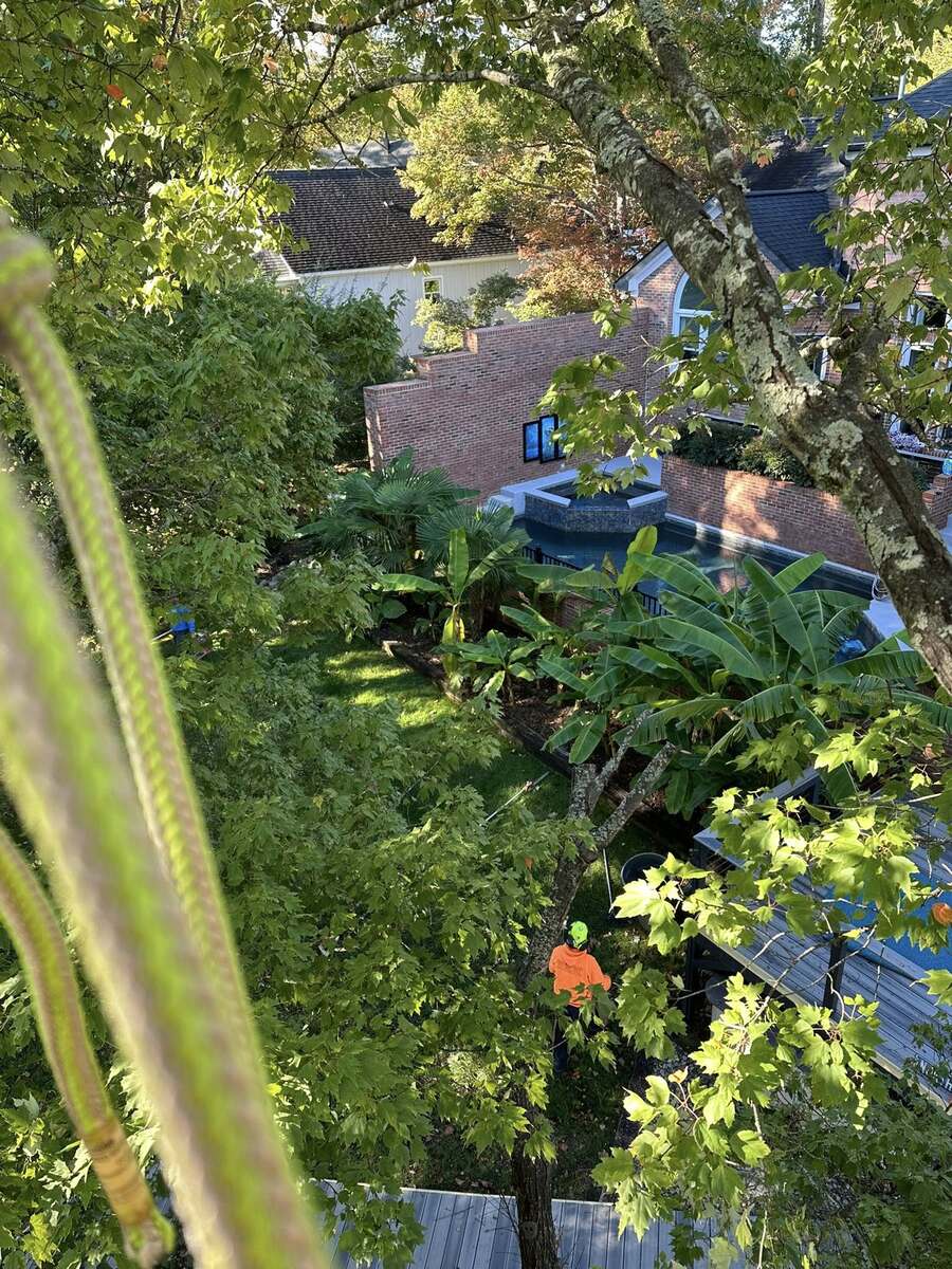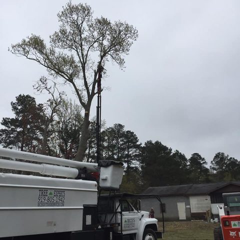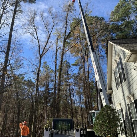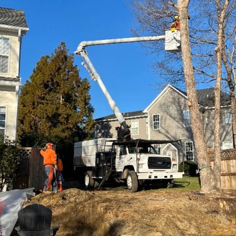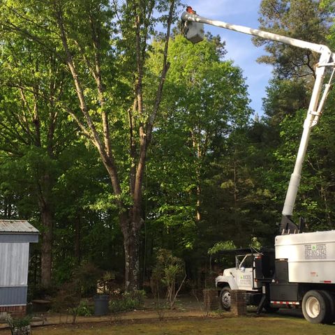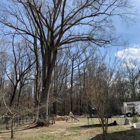 Safely removed large oak and several other trees with state of the art equipment. This machine can reach up to 100 foot. Grabs section of the tree, cuts it and lays it down to be processed by ground crew.