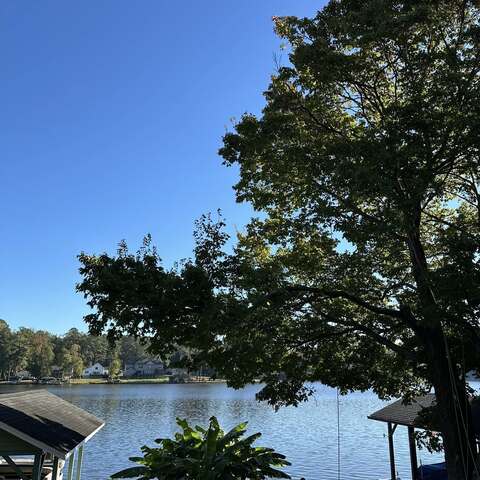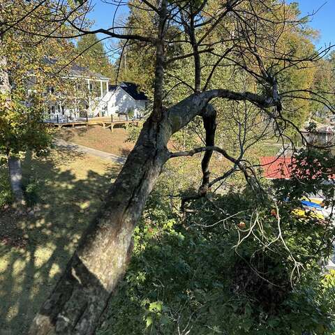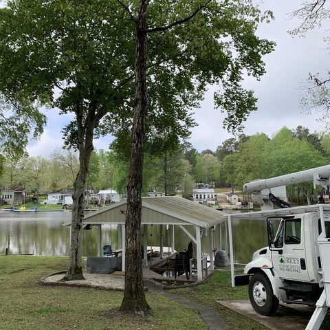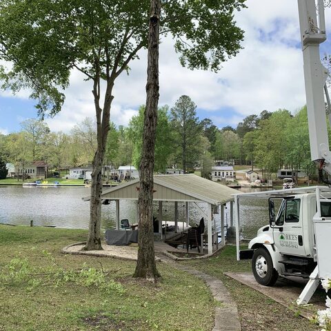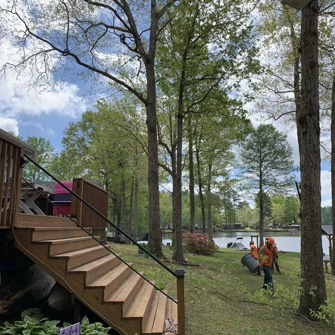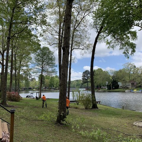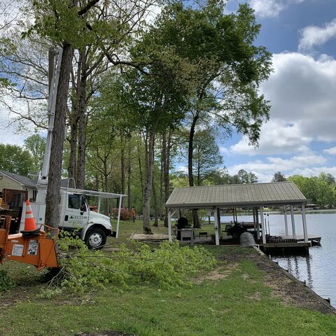 Removing large dead branches over landscaping and walkways at the lake